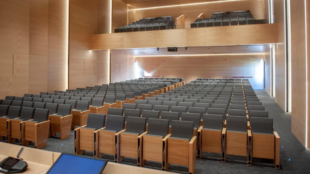 Traitement acoustique : Installation de 253 m² d’absorbeurs poreux pour gérer les fréquences moyennes et hautes, et utilisation de modules FRPA de Lambda Labs pour les basses fréquences jusqu’à 25 Hz.